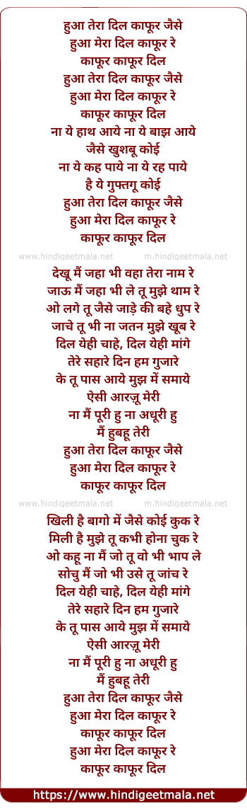Lyrics of Hua Tera Dil Kafur - हुआ तेरा दिल काफूर जैसे