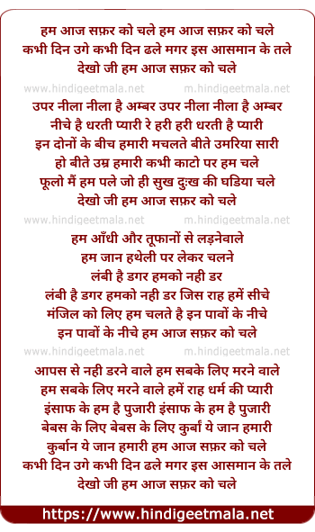 Lyrics of Hum Aaj Safar Ko Chale, Kabhi Din Uage Kabhi Din Dhale - हम आज सफ़र को चले, कभी दिन उगे कभी दिन ढ़ले