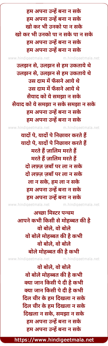 Lyrics of Hum Apana Unhe Bana Na Sake - हम अपना उन्हें बना न सके