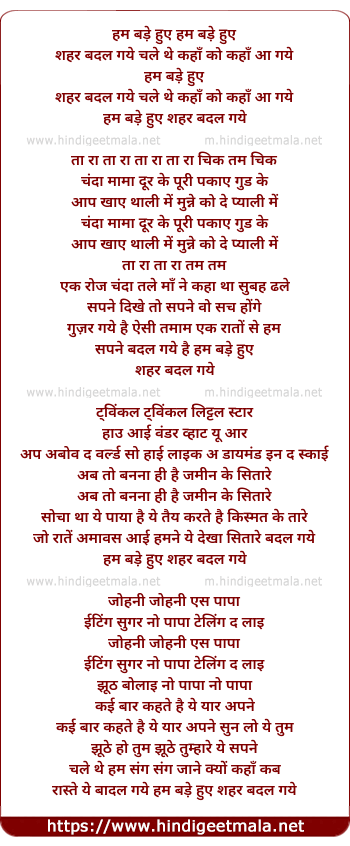 Lyrics of Hum Bade Hue Shahar Badal Gye - हम बड़े हुए शहर बदल गये