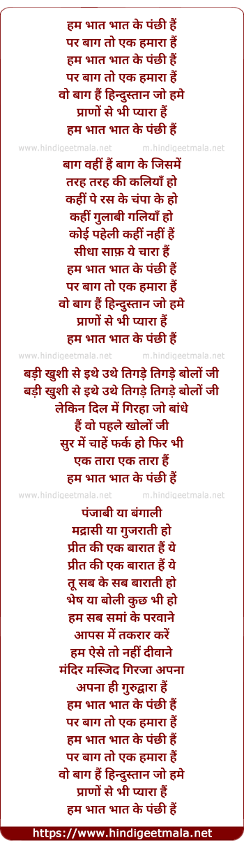 Lyrics of Hum Bhant Bhant Ke Panchi Hai - हम भात भात के पंछी हैं