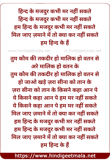 Lyrics of Hind Ke Mazdur Kabhi Mar Nahi Sakte - हिन्द के मजदुर कभी मर नहीं सकते
