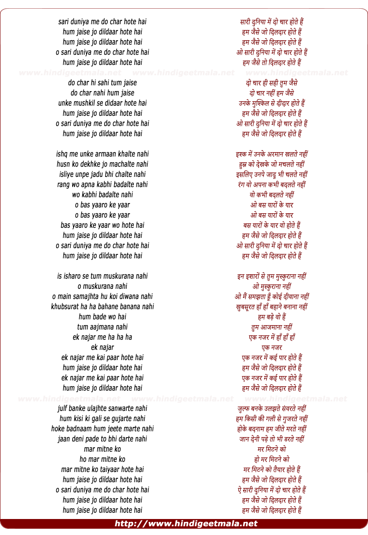 Lyrics of Hum Jaise Jo Dildaar Hote Hain - हम जैसे जो दिलदार होते हैं