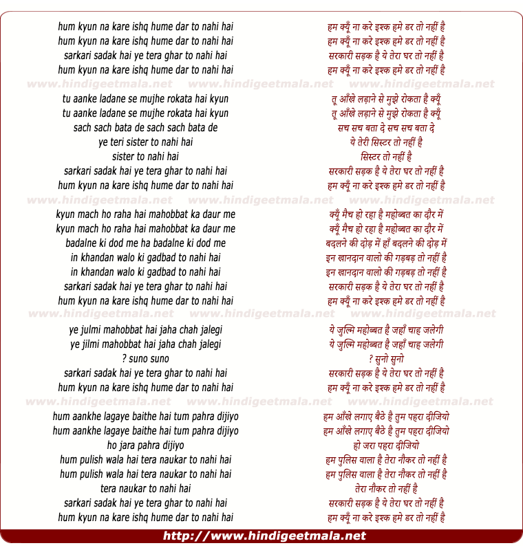 Lyrics of Hum Kyu Na Kare Ishq - हम क्यूँ ना करे इश्क हमे डर तो नहीं है