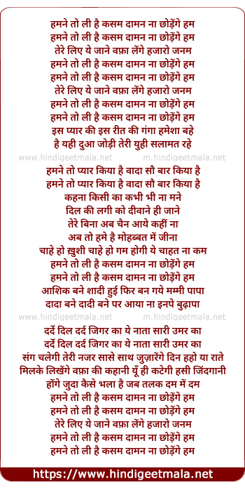 Lyrics of Hum Ne To Li Hai Kasam - हमने तो ली है कसम