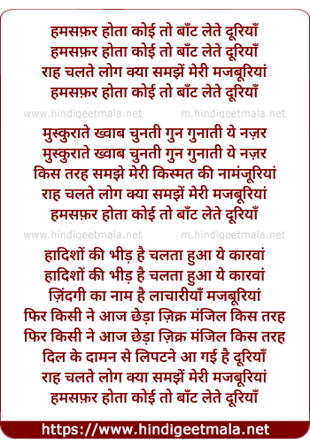 Lyrics of Hum Safar Hotaa Koi To - हमसफ़र होता कोई तो
