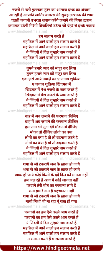 Lyrics of Hum Salaam Karte Hai Mehfil Me Aane Walo - हम सलाम करते है महफ़िल में आने वालो