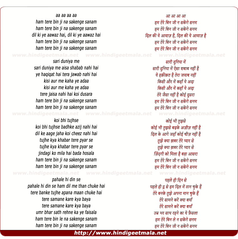 Lyrics of Hum Tere Bin Jee Na Sakenge - हम तेरे बिन जी ना सकेंगे