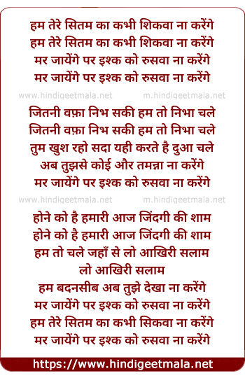 Lyrics of Hum Tere Sitam Ka Kabhi Shikva Na Karege - हम तेरे सितम का कभी शिकवा ना करेंगे