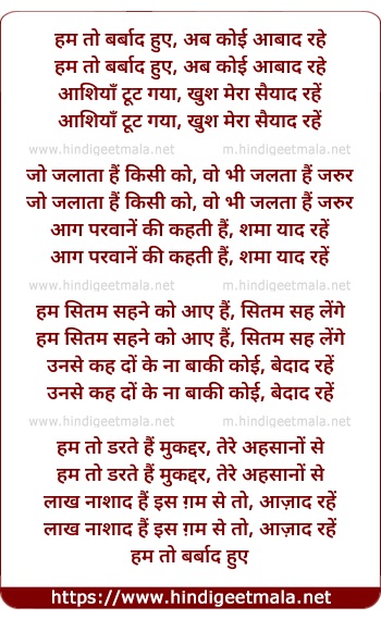 Lyrics of Hum To Barbaad Huye - हम तो बर्बाद हुए, अब कोई आबाद रहे