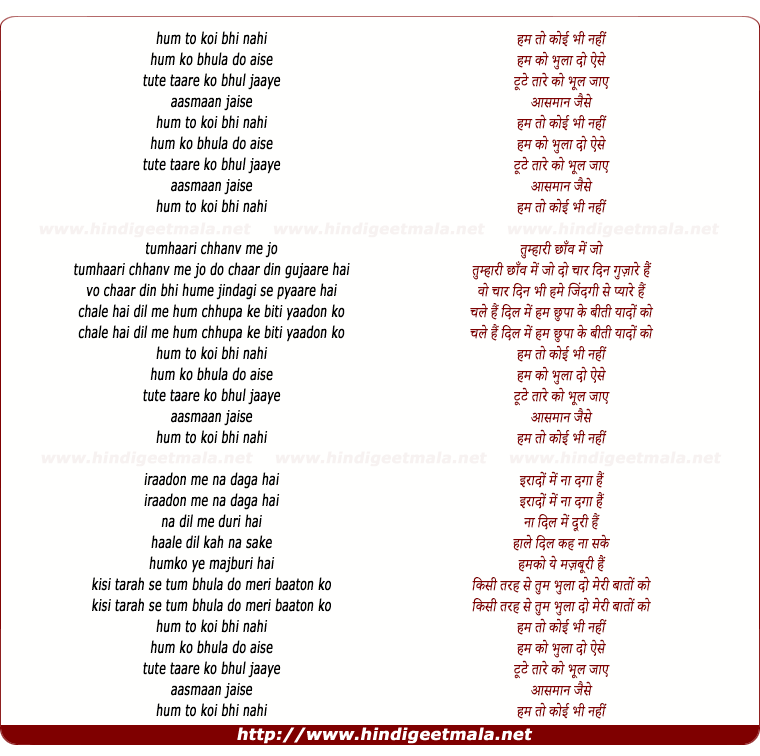 Lyrics of Hum To Koi Bhi Nahi Hum Ko Bhula Do Aise - हम तो कोई भी नहीं हम को भुला दो ऐसे