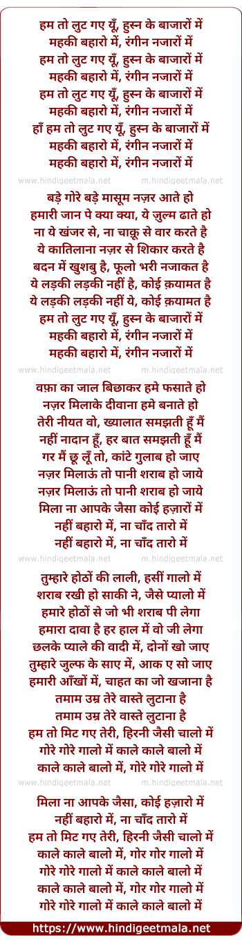 Lyrics of Hum To Loot Gaye Husn Ke Bazaro Me - हम तो लुट गए हुस्न के बाजारों में