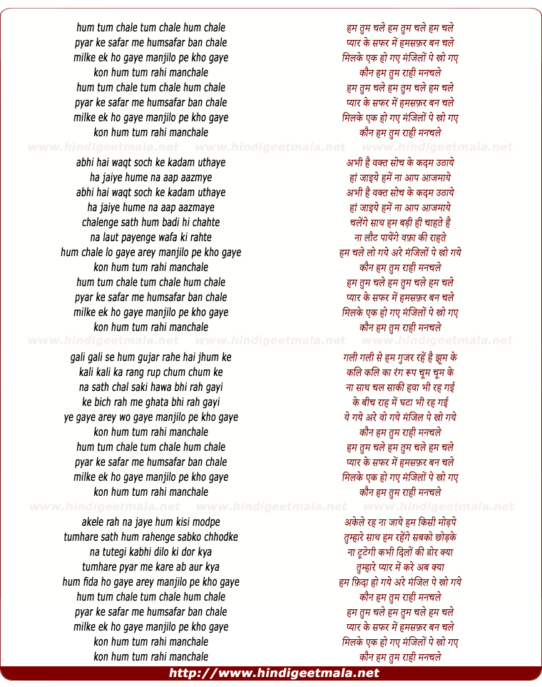 Lyrics of Hum Tum Chale - हम तुम चले