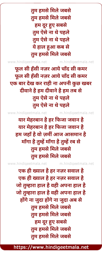 Lyrics of Hum Tum Se Mile Jab Se - तुम हम से मिले जब से
