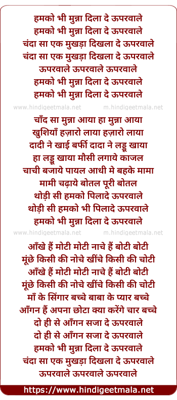 Lyrics of Humko Bhi Munna Dila De Upar Waale - हमको भी मुन्ना दिला दे ऊपरवाले