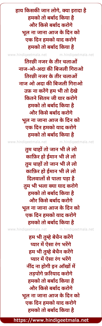 Lyrics of Humko To Barbaad Kiya Hai - हमको तो बर्बाद किया है