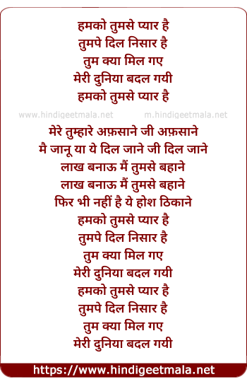Lyrics of Humko Tumse Pyar Hai - हमको तुमसे प्यार है