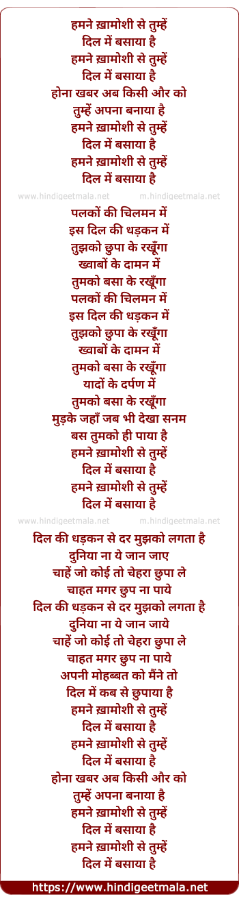 Lyrics of Humne Khamoshi Se Tumhe - हमने ख़ामोशी से तुम्हें