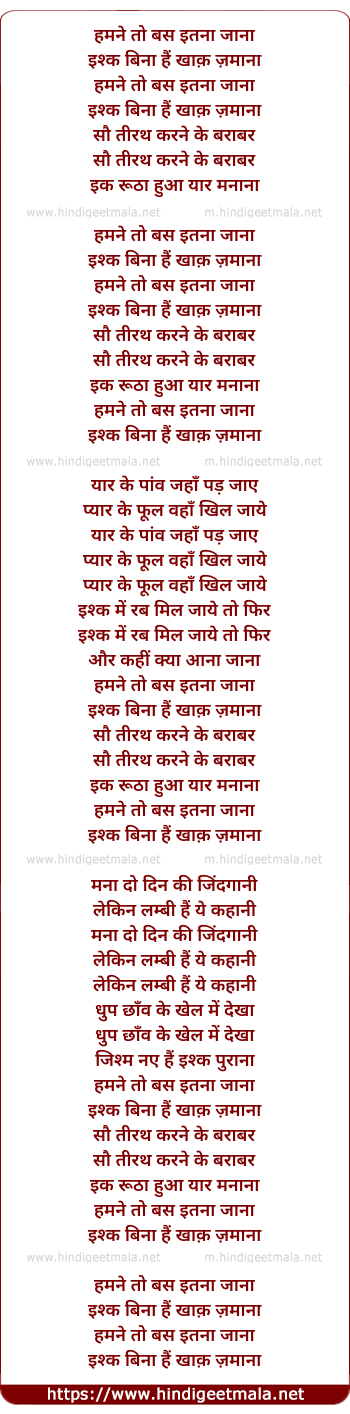 Lyrics of Humne To Bas Itna Hi Jana - हमने तो बस इतना जाना