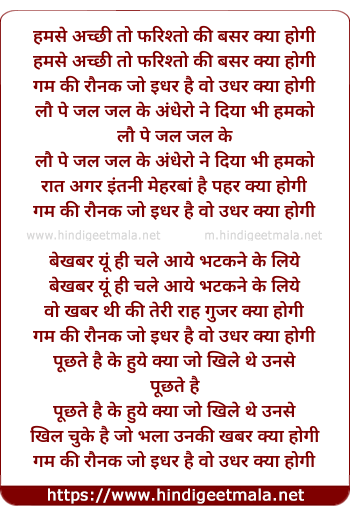 Lyrics of Humse Achhi To Farishto Ki Basar Kya Hogi - हमसे अच्छी तो फरिश्तो की बसर क्या होगी