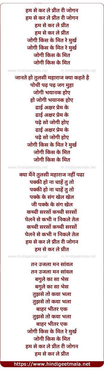 Lyrics of Humse Kar Le Preet Ri Jogan - हम से कर ले प्रीत री जोगन