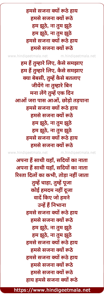 Lyrics of Humse Sajana Kyon Ruthe - हमसे सजना क्यों रूठे