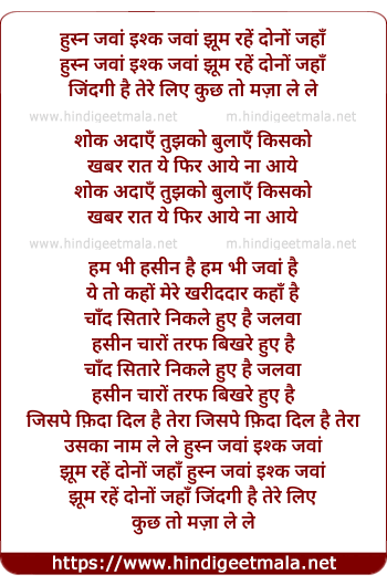 Lyrics of Husn Jawan Ishq Jawan Jhum Rahe Dono Jahan - हुस्न जवां इश्क जवां झूम रहें दोनों जहाँ