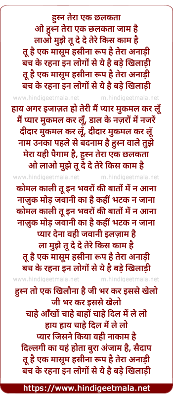 Lyrics of Husn Tera Ek Chalakta Jaam Hai - हुस्न तेरा एक छलकता जाम है