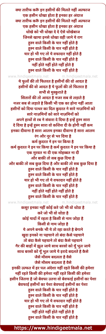 Lyrics of Husn Wale Kisi Ke Yaar Nahi Hote - हुस्न वाले किसी के यार नहीं होते