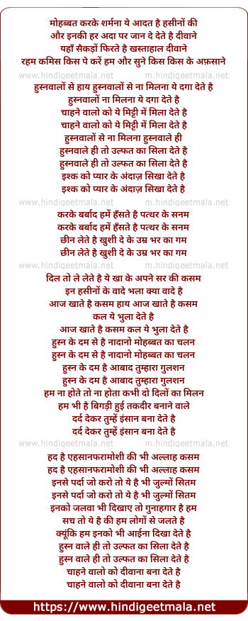 Lyrics of Husnwalon Se Na Milna Ye Daga Dete Hai - हुस्नवालों से ना मिलना ये दगा देते है
