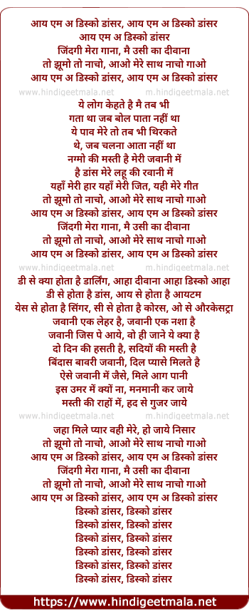 Lyrics of I Am A Disco Dancer, Jindagi Mera Gana - आय एम ऐ डिस्को डांसर, जिंदगी मेरा गाना