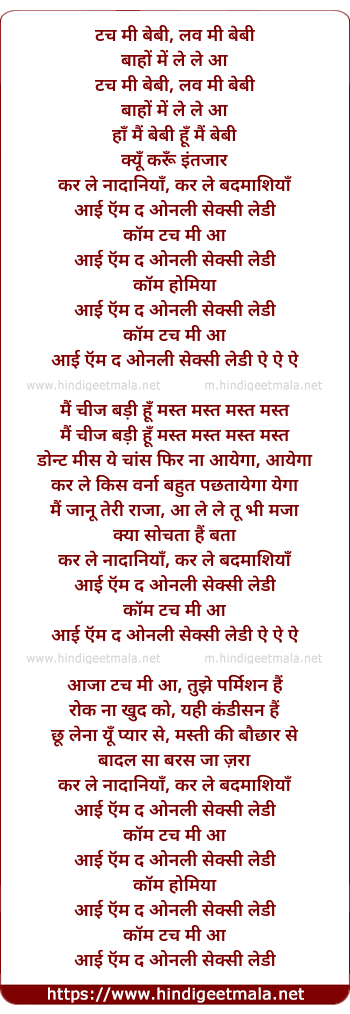 Poetic Translation - Lyrics of I Am The Only Sexy Lady - टच मी बेबी, लव मी बेबी