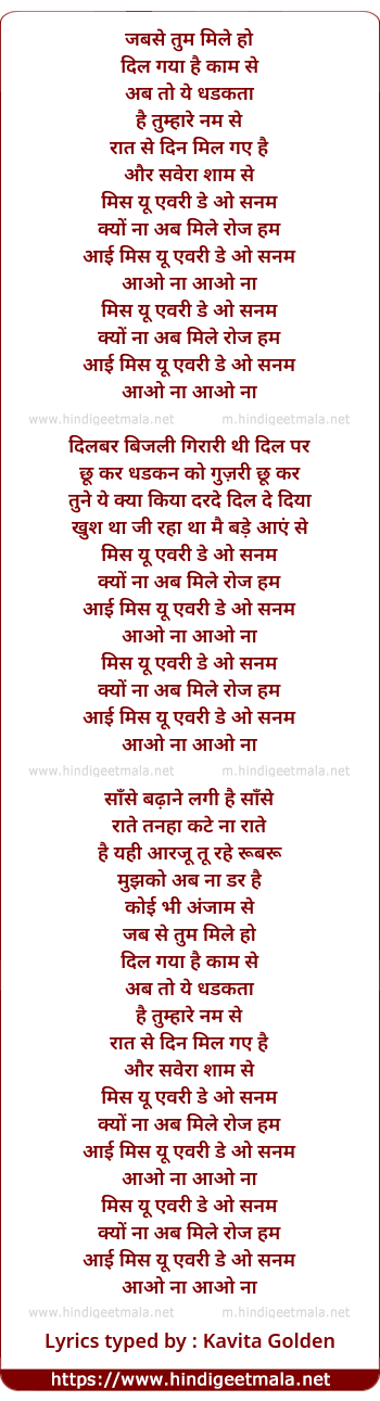 Lyrics of I Miss U Everyday O Sanam - आई मिस यू एवरी डे ओ सनम