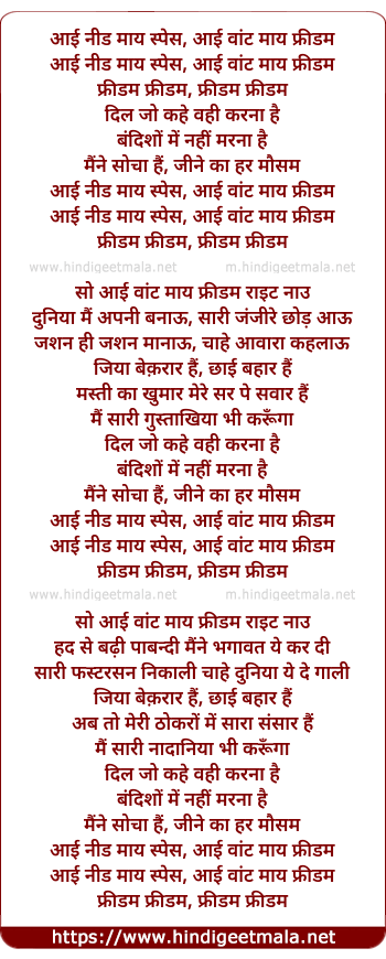 Lyrics of I Need My Spacee - आई नीड माय स्पेस