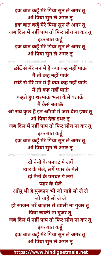 Lyrics of Ik Bat Kahu Mere Piya Sun Le - इक बात कहूँ मेरे पिया सुन ले