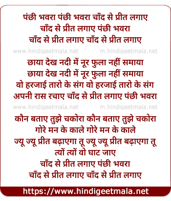 Lyrics of Ik Bawara Panchi Nadiya Ke Kinare - पंछी भवरा पंछी भवरा चाँद से प्रीत लगाए