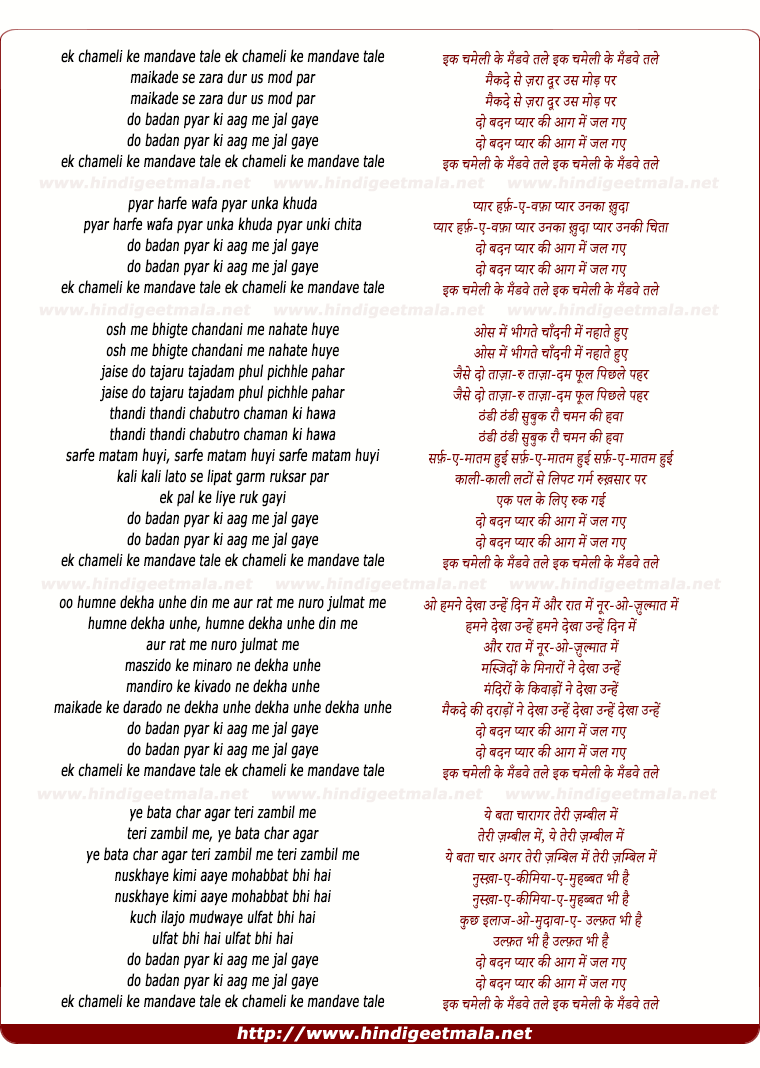 Lyrics of Ik Chamelee Key Mandave Tale - इक चमेली के मँडवे तले