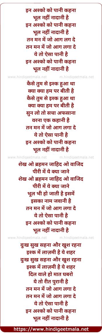 Lyrics of In Ashqo Ko Pani Kehna - इन अश्को को पानी कहना