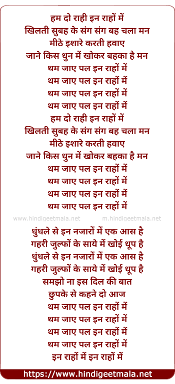 Lyrics of In Raho Me - हम दो राही इन राहों में