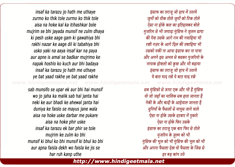 Lyrics of Insaf Ka Tarazu Jo Hath Me Uthaye - इंसाफ का तराजू जो हाथ में उठाये