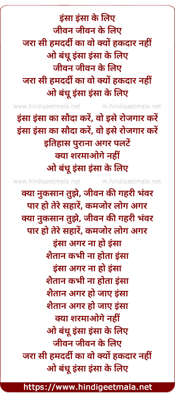 Lyrics of Insaan Insaan Ke Liye - इंसा इंसा के लिए