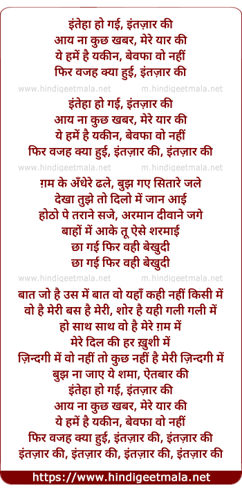 Poetic Translation - Lyrics of Inteha Ho Gayi - इंतेहा हो गई, इंतज़ार की