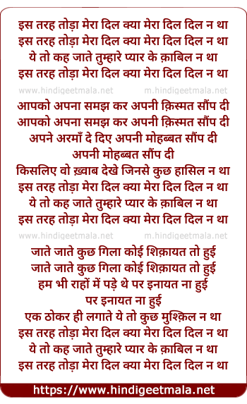 Lyrics of Is Tarah Toda Mera Dil Kya Mera Dil - इस तरह तोड़ा मेरा दिल क्या मेरा दिल