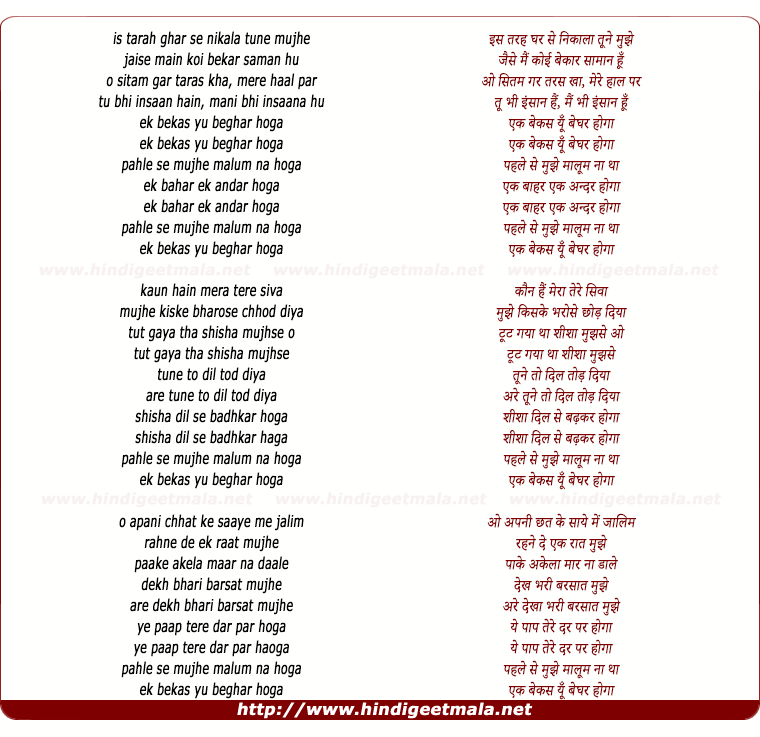 Lyrics of Is Tarah Tune Ghar Se Nikala Mujhe - इस तरह तूने घर से निकाला मुझेis tarah ghar se nikala tune mujhe