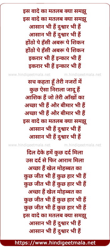 Lyrics of Is Vaade Ka Matlab Kya Samjhu - इस वादे का मतलब क्या समझू