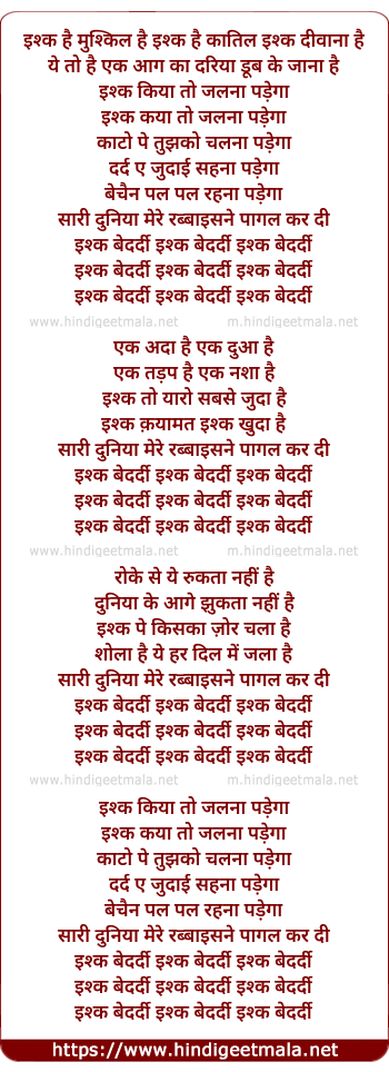Lyrics of Ishq Bedardi Ishq Bedardi - इश्क बेदर्दी इश्क बेदर्दी