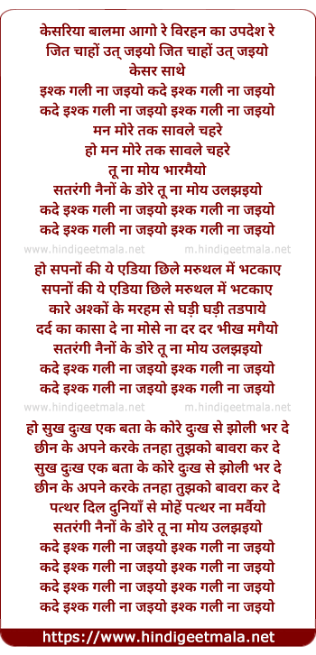 Lyrics of Ishq Gali Naa Jaiyo - केसरिया बालमा आगो रे विरहन का उपदेश रे