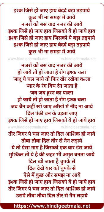 Lyrics of Ishq Jise Ho Jaye - इश्क जिसे हो जाए हाय बेदर्द बड़ा तड़पाये
