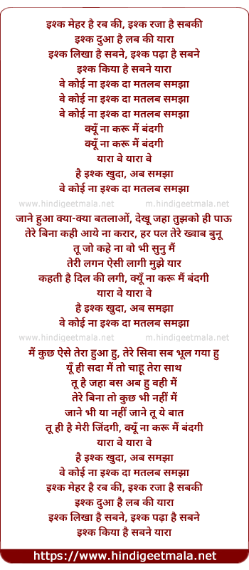 Lyrics of Ishq Khuda, Ishq Mehar Hai Rab Ki - इश्क खुदा, इश्क मेहर है रब की