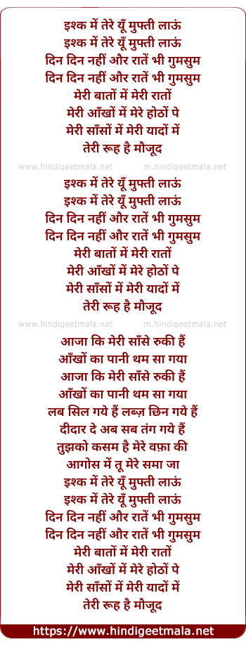 Lyrics of Ishq Me Tere - इश्क में तेरे यूँ मुफ्ती लाऊं